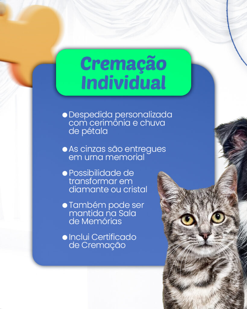 Para os Pets Trabalhamos com 2 tipos de preventivos todos serviços tem *carência de 24h*⚠️ Garanta tranquilidade e menor custo no momento da perda. Ideal para tutores que desejam se preparar com carinho. A mais completo *Cremação Exclusiva*: Cremação individual do Pet; Remoção de (150 km rodados); Banho; Estrutura para cerimônia; E Cinzas entregues em urna padrão.